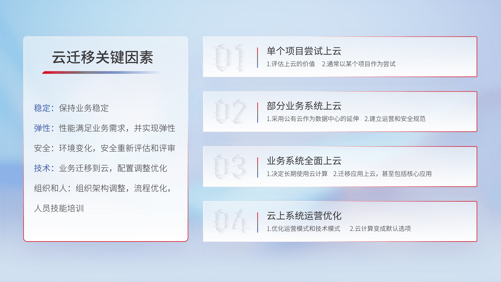 结合实际业务,,,,从规划设计、、、、云平台选型、、、云原生改造、、、数据迁移、、、集成交付,,,迁移全过程为客户识别最佳上云路径,,,做好风险识别管理,,,,设计网络架构、、、身份权限、、安全审计合规、、、操作审计、、日志审计、、监控告警策略、、、多站点容灾设计等,,,对云上基础设施进行整体规划,,,提升IT治理水平,,,以满足弹性、、、、高可用、、、高性能的需求。。