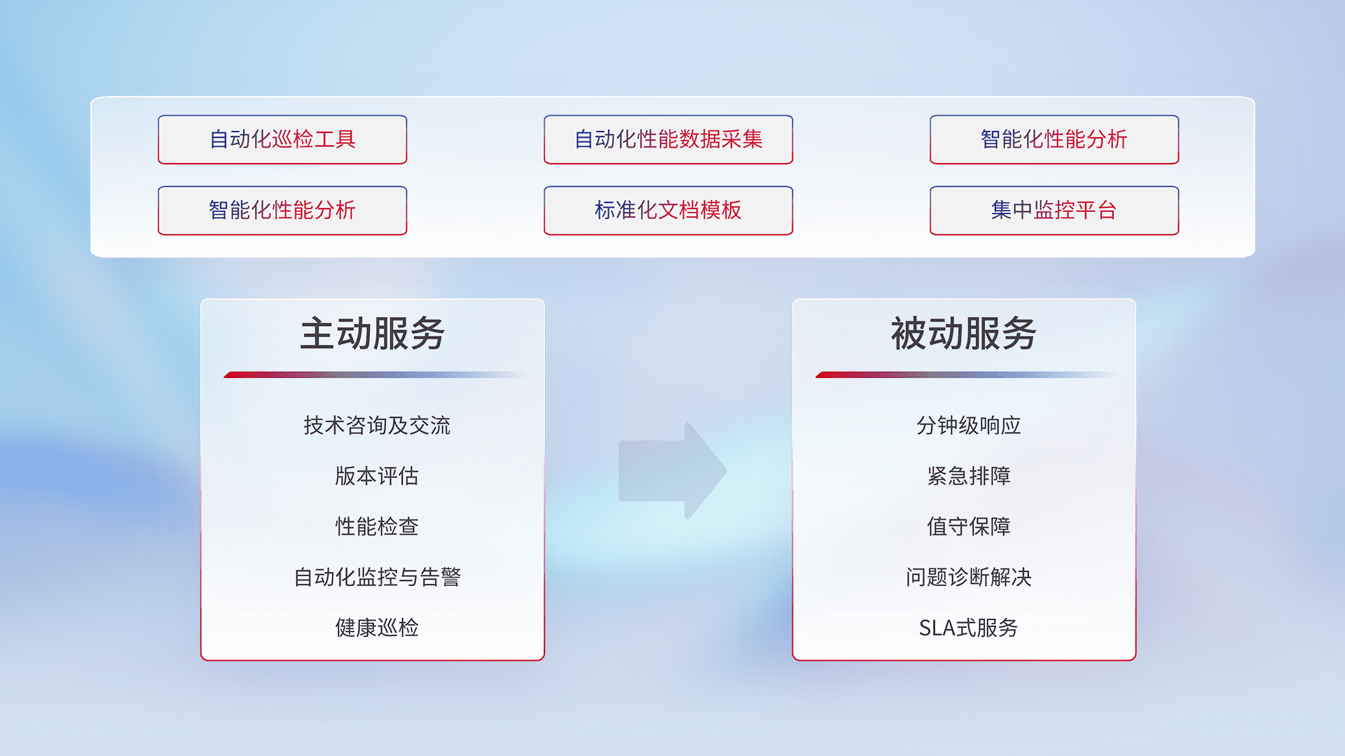 智能化工具和标准化文档,,保障服务质量,,,提供主动服务(包含技术咨询、、版本评估、、性能检查、、自动化监控与告警、、、、健康巡检)和被动服务包含(分钟级响应、、紧急排障、、值守保障、、、、问题诊断解决、、、SLA服务)。。。